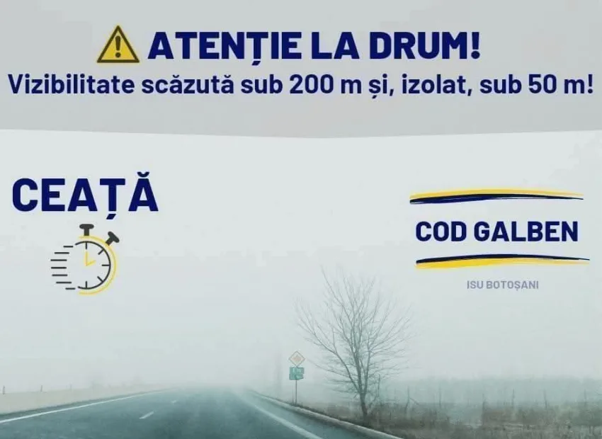 Din această cauză, pe drumurile din Hudești, Coțușca, Rădăuți-Prut, Avrămeni, Manoleasa, Păltiniș, Mileanca, Darabani, Viișoara, Concești, Mitoc și Adășeni se va reduce vizibilitatea sub 200 de metri, izolat sub 50 de metri. Pentru prevenirea unor evenimente nedorite, conduceți prudent, reduceți viteza, folosiți sistemul de iluminare, măriți distanța dintre autovehicule, evitați orice manevră riscantă. Pompierii militari…