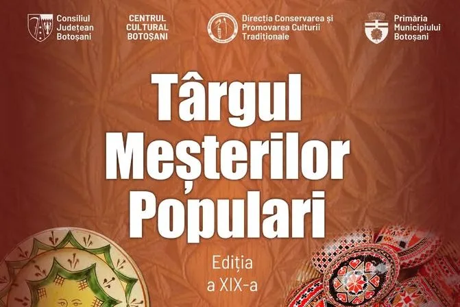 Centrul Cultural Botoșani, prin Direcția Conservarea și Promovarea Culturii Tradiționale, instituție publică aflată în subordinea Consiliului Județean Botoșani, cu sprijinul Primăriei Municipiului Botoșani, organizează în perioada 23-26 aprilie 2026 cea de-a XIX-a ediție a Târgului Meșterilor Populari, eveniment care se va desfășura pe Pietonalul Unirii din Municipiul Botoșani. Evenimentul se înscrie în tradiția celebrării zilei…
