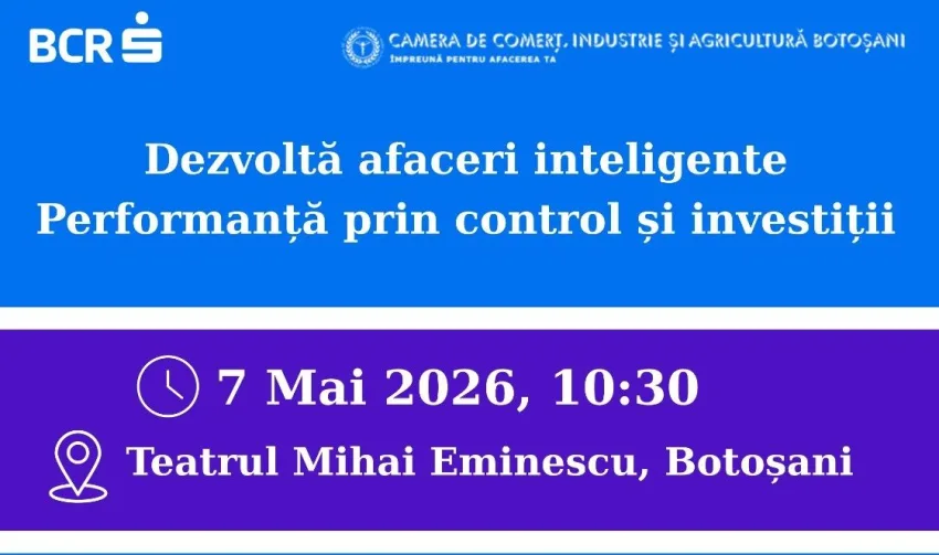 Camera de Comerț și Industrie Botoșani, alături de BCR, organizează evenimentul de business „Dezvoltă afaceri inteligente. Performanță prin control și investiții”