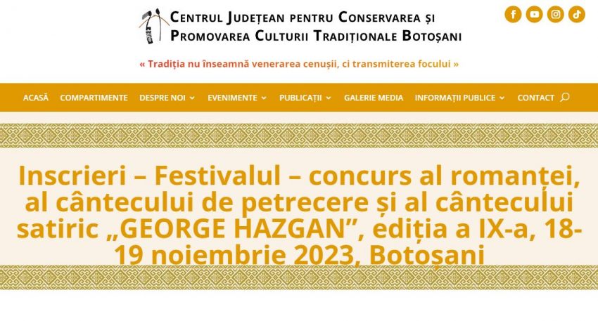 Centrul Judeţean pentru Conservarea şi Promovarea Culturii Tradiţionale Botoşani, cu sprijinul Consiliului Judeţean Botoşani, organizează cea de-a IX-a ediţie a Festivalului – concurs al romanţei, al cântecului de petrecere şi al cântecului satiric „GEORGE HAZGAN”, manifestare cultural-artistică ce se va desfăşura în perioada 18-19 noiembrie 2023, la Casa Tineretului Botoşani. Dorim dezvoltarea interesului în rândul…