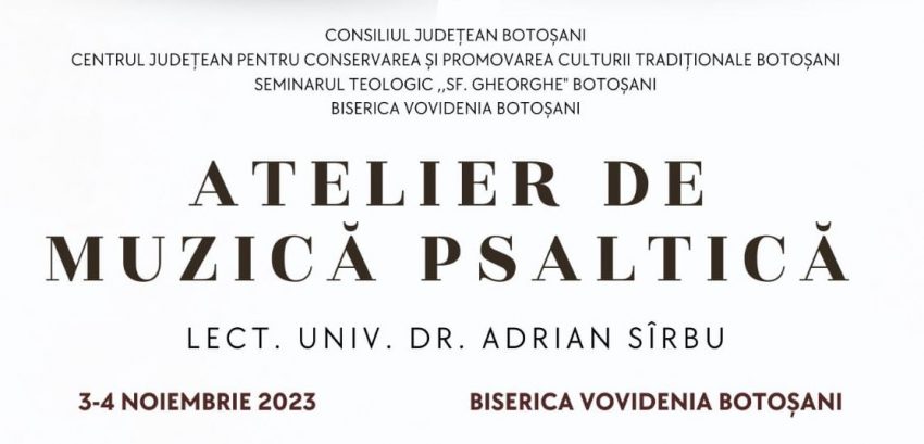 Centrul Județean pentru Conservarea și Promovarea Culturii Tradiționale Botoșani, cu sprijinul Consiliului Județean Botoșani, în parteneriat cu Seminarul Teologic Liceal Ortodox „Sf. Gheorghe” Botoșani și cu Parohia Vovidenia Botoșani, organizează în perioada 3-4 noiembrie 2023 un Atelier de Muzică Psaltică la Botoșani. Muzica bizantină (psaltică) reprezintă adevărata emblemă a artei bizantine. Izvorâtă din adâncul vieţii…