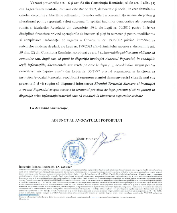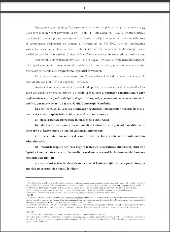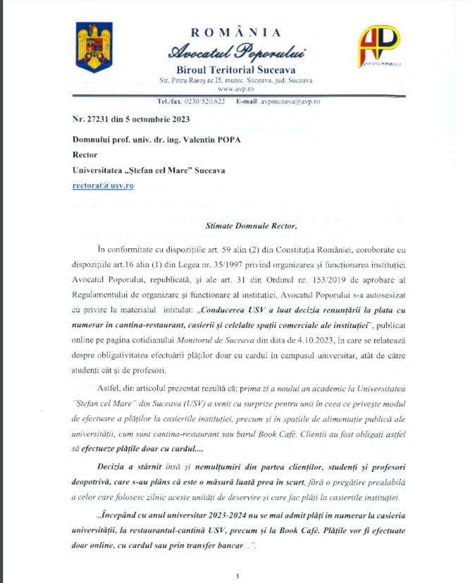 După ce rectorul Universității „Ștefan cel Mare” Suceava, Valentin Popa a interzis toate plățile în numerar pentru taxele de studii și serviciile oferite de instituție, inclusiv pentru cantină și cazarea studenților, Biroul Teritorial al Avocatului Poporului la Suceava a deschis o anchetă tocmai pentru a afla motivele care au dus la acest lucru. Avocatul Poporului s-a autosesizat din materialele care au apărut în mass-media suceveană și a cerut universității informații complete.