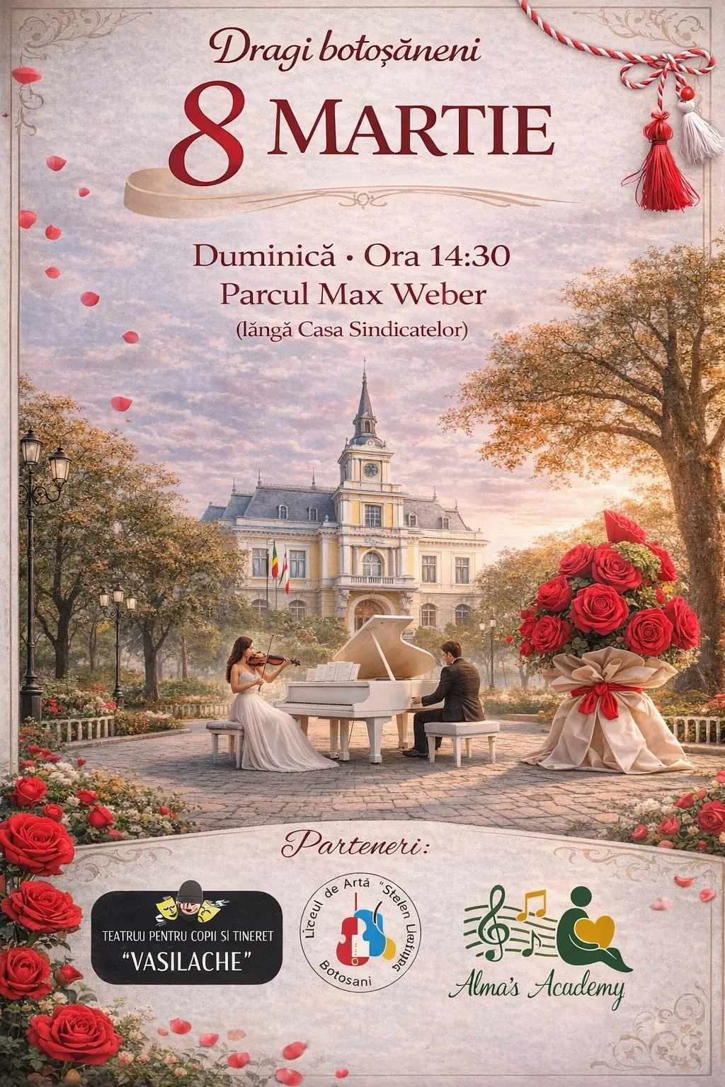 Duminică, de la ora 14:30, vă invităm în Parcul „Max Weber”, lângă Casa Sindicatelor, la un moment artistic deosebit: un dialog muzical între pian și vioară, un schimb de armonii și emoții dedicat femeilor din viața noastră.