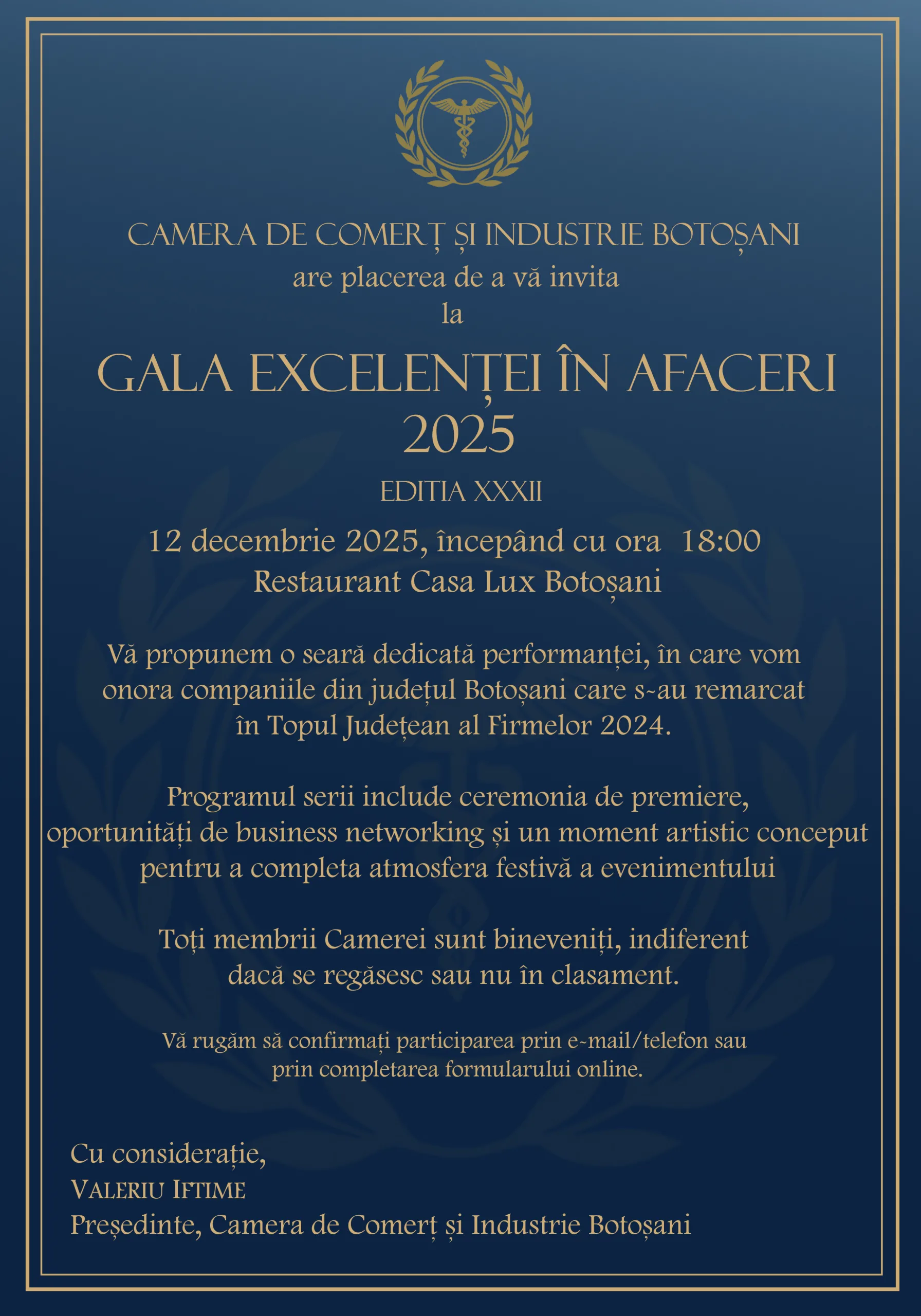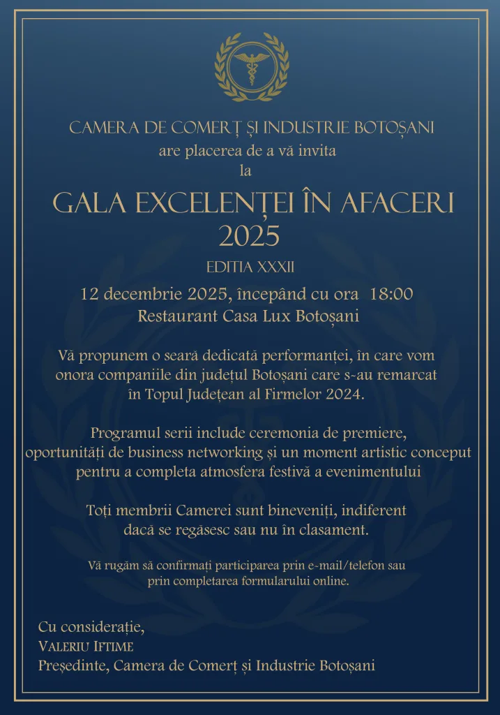 Camera de Comerț și Industrie Botoșani anunță organizarea Galei Excelenței în Afaceri – Ediția XXXII, evenimentul-reper al comunității de business locale, care va avea loc vineri, 12 decembrie 2025, începând cu ora 18:00, la Restaurant Casa Lux, Botoșani.