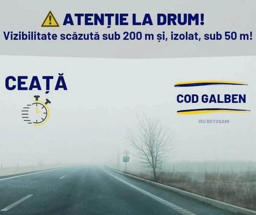 Meteorologii au prelungit avertizarea de cod galben de ceață pentru o parte din județul Botoșani până la ora 12:00. Din cauza fenomenelor meteo, vizibilitatea pe drumurile din Hudești, Coțușca, Suharău, Havârna, Rădăuți-Prut, Cristinești, Avrămeni, George Enescu, Manoleasa, Păltiniș, Vlăsinești, Mileanca, Pomârla, Știubieni, Darabani, Drăgușeni, Mihălășeni, Viișoara, Hănești, Săveni, Ripiceni, Concești, Mitoc, Adășeni scade sub 200…