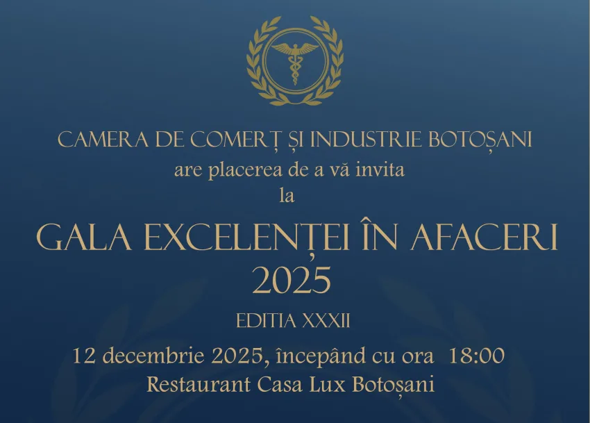 Camera de Comerț și Industrie Botoșani anunță organizarea Galei Excelenței în Afaceri – Ediția XXXII, evenimentul-reper al comunității de business locale, care va avea loc vineri, 12 decembrie 2025, începând cu ora 18:00, la Restaurant Casa Lux, Botoșani. Evenimentul marchează recunoașterea companiilor performante din județ, pe baza Topului Județean al Firmelor aferent anului 2024, întocmit…