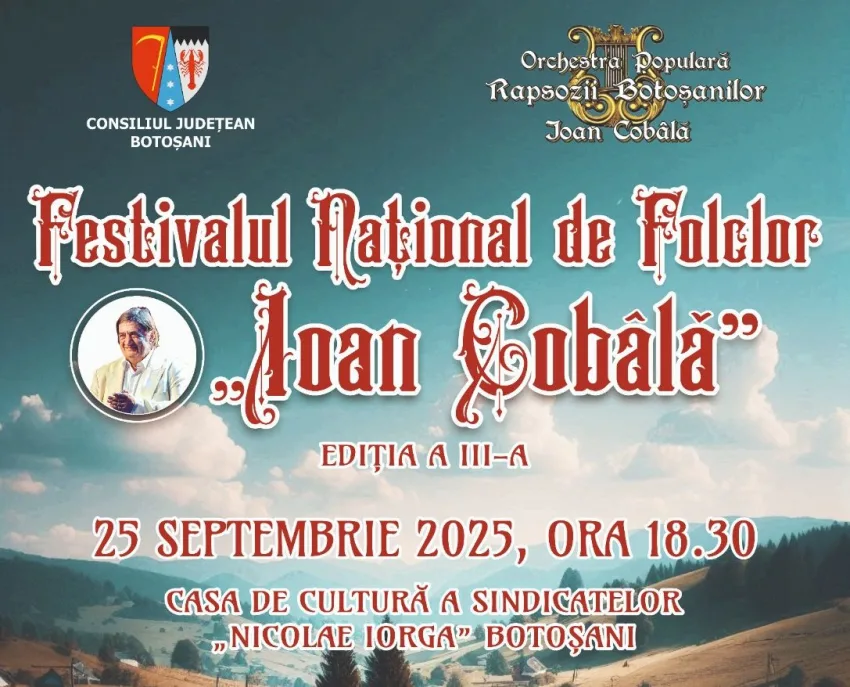 Orchestra Populară ,,Rapsozii Botoșanilor” Ioan Cobâlă, instituție aflată în subordinea Consililui Județean Botoșani, deschide stagiunea 2025 – 2026 cu organizarea în perioada 25 și 26 septembrie a Festivalului Național de Folclor ,,Ioan Cobâlă”- ediția III și a Spectacolului Aniversar a 55 de ani de activitate artistică. Festivalul poartă numele maestrului Ioan Cobâlă, dirijor și promotor…