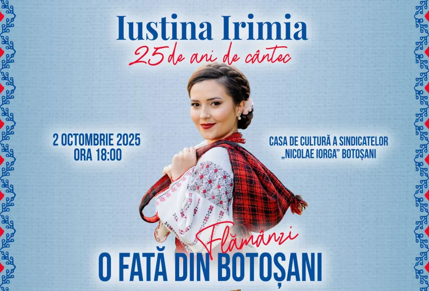 Deși face parte din tânăra generație de interpreți ai muzicii populare, Iustina Irimia, o fată din Flămânzii Botoșanilor, sărbătorește anul acesta 25 de ani de carieră, într-un spectacol de folclor organizat în data de 2 octombrie 2025, începând cu ora 18, la Casa de Cultură a Sindicatelor „Nicolae Iorga” Botoșani. Chiar dacă aptitudinile artistice i-au…