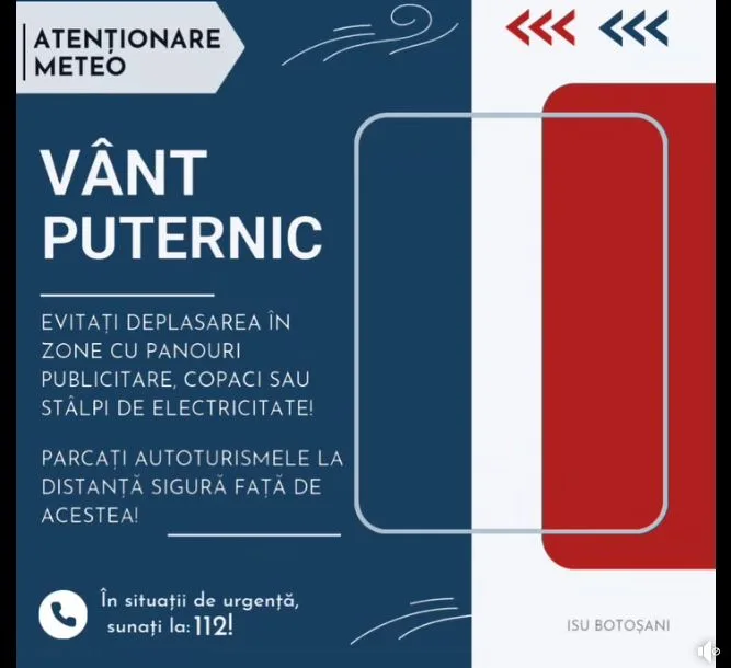 Județul Botoșani va fi sub incidența unui Cod Galben de vânt astăzi, între orele 11:40 – 17:00. Potrivit meteorologilor, vor fi intensificări ale vântului cu viteze la rafală de 50…65 km/h și izolat 70 km/h. Pentru a preveni situațiile de urgență, recomandăm cetățenilor respectarea următoarelor măsuri: ✔️ fiți prudenți atunci când vă aflați pe stradă…