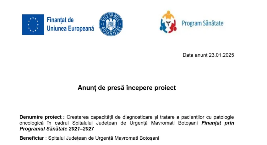 Anunț începere proiect “Creșterea capacității de diagnosticare și tratare a pacienților cu patologie oncologică în cadrul Spitalului Județean de Urgență Mavromati Botoșani” Finanțat prin Programul Sănătate 2021-2027
