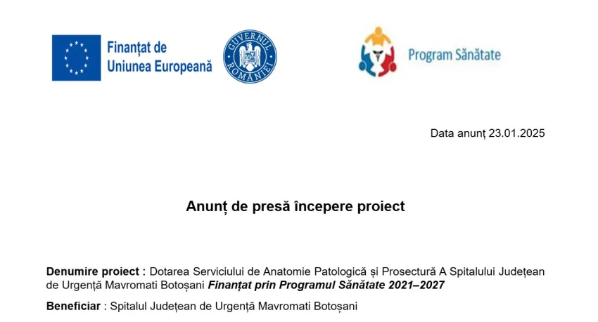 Anunț începere proiect “Dotarea Serviciului de Anatomie Patologică și Prosectură a Spitalului Județean de Urgență Mavromati Botoșani” Finanțat prin Programul Sănătate 2021-2027